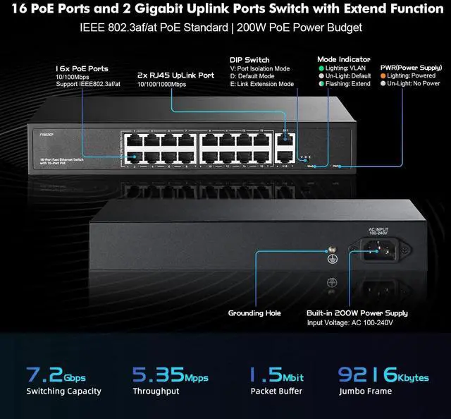 18 PortsIncludes 16 ports 10/100Mbps POE and 2 Gigabit Uplink(100/1000Mbps); supports port automatically adaptive. The 2 gigabit uplink support higher rate than 100M port, improve 1-16 port bandwidth utilization. ^^ IEEE 802.3 af/atPoE Ports 1-16 support ieee 802.3 af/at POE, max 30W; The whole machine output power is 200W. Output POE voltage 44~57V, typical value 48V.