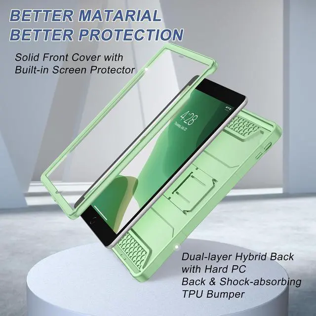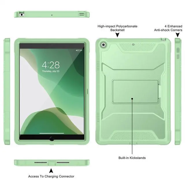 CompatibilityExclusively designed for Apple 10.2 -Inch iPad 9th generation 2021 Release (A2602 A2603 A2604 A2605); iPad 8th Generation 2020 Release (A2270 A2428 A2429 A2430); iPad 7th Generation 2019 Release (A2197 A2198 A2200) ^^ Rugged Armor Full ProtectionMulti-layered hard PC back and flexible TPU bumper provide full protection against drops, bumps, and impacts, also easy to install ^^ Built-in Screen ProtectorPrevents your New Apple iPad 9th / 8th / 7th Gen screen from scratches without compromising sensitivity and provides full protection ^^ Precise Cutouts Precise cutouts and design allow easy access to all ports, sensors, speakers, cameras without removing the case ^^ Built-in KickStand Functional pop-out kickstand with dual stand angles for easily enjoying movies and better working.