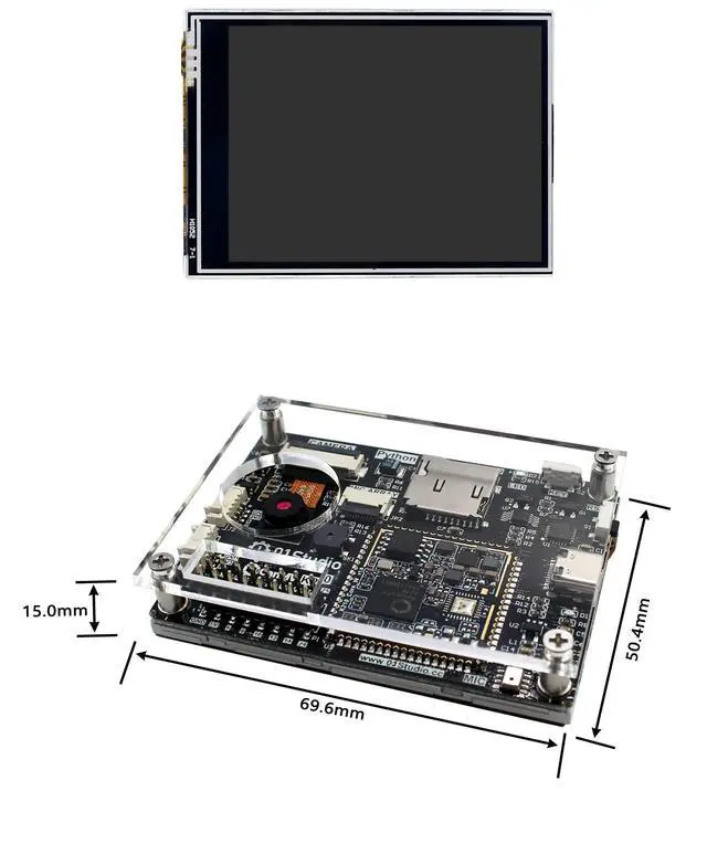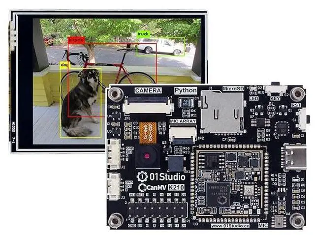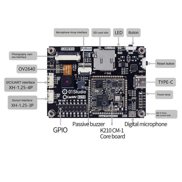 CanMV K210 is a development board designed and developed by 01Studio. Based on CanMV edge computing chip K210 (RSIC-V architecture, 64-bit dual-core) and CanMV open source project. The hardware adopts an integrated design (K210 core board, camera, LCD integrated on a PCB), ready to use.