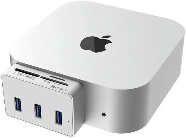 M4 comes at a cost: a lack of traditional USB ports. Our Mac mini M4 hub solves this perfectly by adding three high-speed USB 3.0 ports (5Gbps each). Effortlessly connect your legacy peripherals like wired keyboards, mice, external hard drives, printers, and more, transforming your minimalist Mac into a fully functional workstation. ^^ Dual Card Readers for Photographers & Creators Transfer photos and videos from your camera in a flash! This Mac mini M4 docking station is equipped with both SD and MicroSD card slots, allowing you to read from two memory cards simultaneously. No more fumbling with dongles or waiting for one card to finish before starting the next. Streamline your creative workflow and enjoy rapid file transfers directly to your Mac or the installed SSD. ^^ Sleek, Secure Aluminum Design, Precision-Engineered Crafted from premium silver aluminum, this Mac mini m4 dock with ssd enclosure is built to last and designed to match the aesthetic of your Apple ecosystem. Its compact form-factor neatly connects to your Mac mini M4's ports without being an eyesore. The sturdy aluminum body also aids in effective heat dissipation, ensuring stable performance even during extended use.