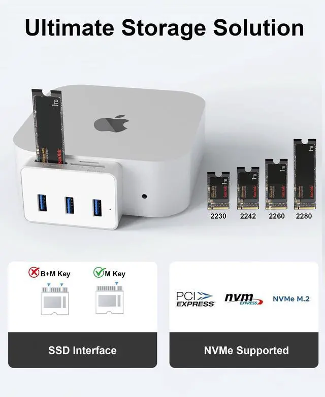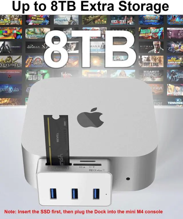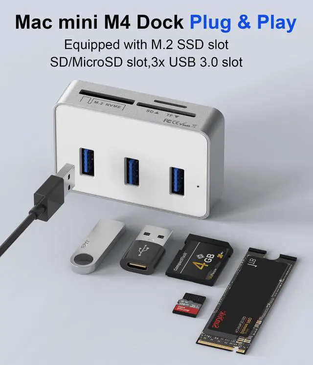 ^^ Your All-in-One Expansion Solution This 6-in-1 mac mini m4 hub with ssd enclosure is the ultimate peripheral hub for your Mac mini M4/M4 Pro. It consolidates your most-needed ports into one elegant and reliable devicemassive storage expansion, versatile USB connectivity, and dual media card readers. Simplify your desk setup, boost your productivity, and unlock the full potential of your Mac mini with this essential Dock for Mac mini M4. ^^ SSD Compatibility Notice Please ensure you purchase an M. 2 NVMe PCIe SSD with 'M Key' notch (single gap). This dock does not support SATA SSDs with 'B&M Key' (two gaps).