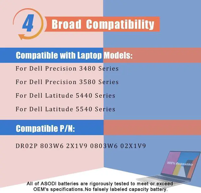 Package includes: a battery + a manual + one set of tools for easy installation. (Please open the back case of your laptop and check out the exact part number of your laptop's original battery Before placing your order) ^^ Compatible Models For Dell Precision 3480 3490 3580 3590 Series // For Dell Latitude 5440 5450 5540 5550 Series ^^ Compatible P/NDR02P 803W6 2X1V9 0803W6 02X1V9 GRWKG ^^ High Quality AssuranceAll ASODI products are Certified by CE, FCC for safety. Strict guidelines for compatibility, and standards compliance for environment safety. We specialize in providing quality products from and quality customer service