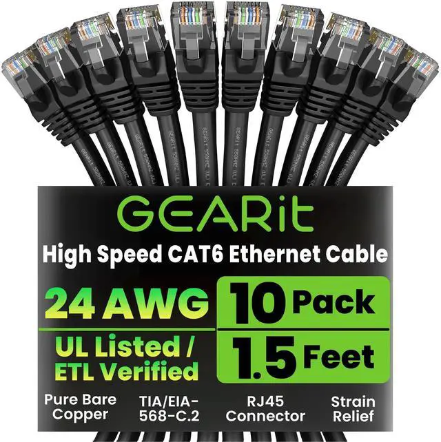High-Performance Cat 6 Ethernet Cable Pack GEARit's 10-pack of 1.5 ft Cat6 ethernet patch cables features 24 AWG UTP stranded conductors twisted in an X-structure spline to minimize crosstalk and deliver full 10 Gbps bandwidth - future-proof network cables for home, office, data-center, and server use. ^^ Advanced Cat6 Technology Engineered to meet or exceed TIA/EIA-568-C. 2 standards, these Cat6 ethernet cables offer up to 550 MHz of throughput at a Cat5e price. Fully backwards compatible with Cat5/5e networks and ready for 10-Gigabit Ethernet applications. ^^ Reliable, Secure Wired Connection Say goodbye to Wi-Fi dropouts - this Cat 6 network cable (aka ethernet cable Cat 6 or RJ45 patch cable) provides rock-solid LAN connections for PCs, servers, routers, printers, gaming consoles, and more, ensuring low-latency, interference-free data transfer.