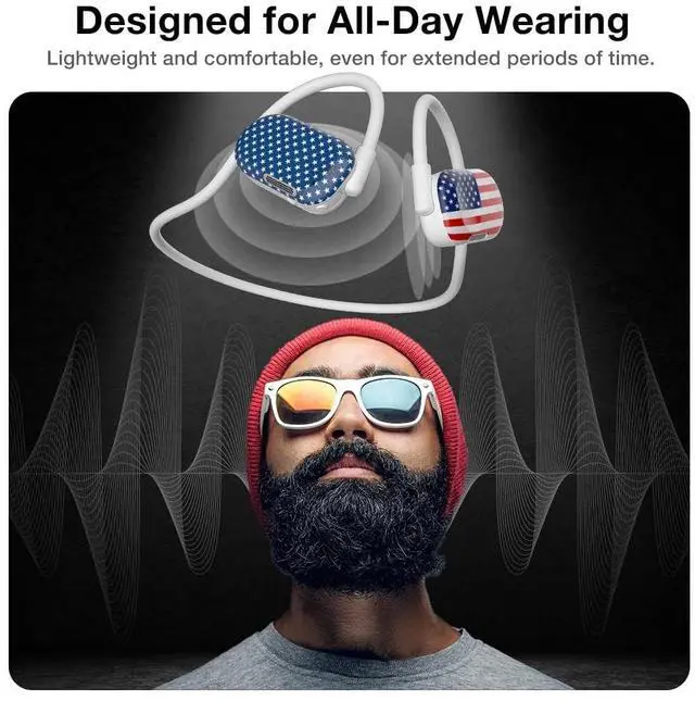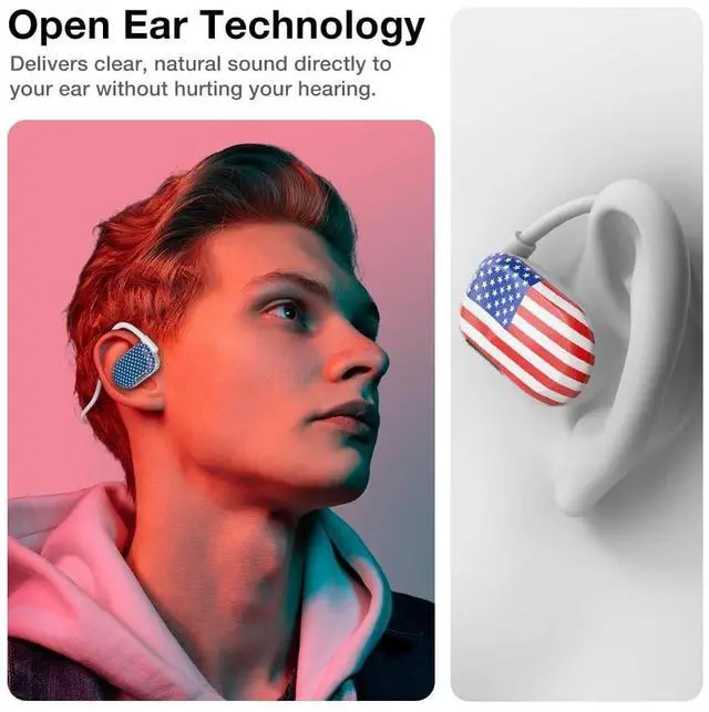 Purity Air Open Ear Headphones - True Air Conduction Wireless Bluetooth Open Ear Earbuds with Dual Mic for iPhone/Android - Secured Long Wearing Comfort, Sports Sweat Resistant (US Flag/Star)