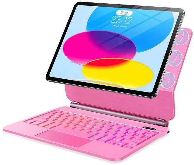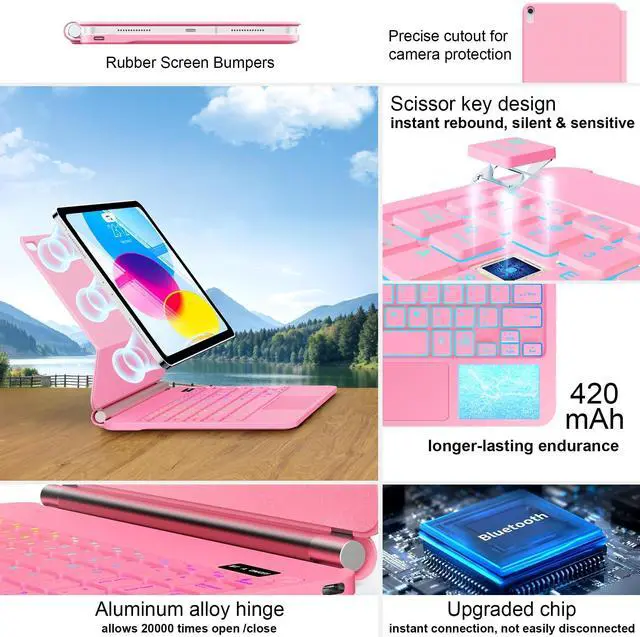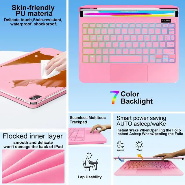 Generation: The keyboard is equipped with a 7-color backlight, adjustable to three different brightness levels. Pleas press FN + Space keys to switch 7 backlight. This feature not only adds a touch of style but also makes typing in low-light conditions more comfortable. The backlighting is engineered for optimal light diffusion, providing a pleasant typing experience whether youre working during the day or night. From dawn to dusk, adapt effortlessly! ^^ Multi-touch trackpad Keyboard for iPad 10.9 inch 10th