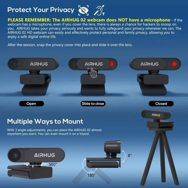 KINDLY REMINDER: The AIRHUG 02 webcam does NOT have a microphone - If the webcam has a microphone, even if you cover the lens, there is always a chance for hackers to snoop on you. AIRHUG takes your privacy seriously and wants to fully safeguard your privacy whenever we can. The AIRHUG 02 HD webcam can easily and effectively protect personal and family privacy, allowing you to enjoy a safe digital online life. ^^ Market-leading Optics Technology - 78-degree wide-angle webcam with a high-speed 1/4-inch 5-megapixel image sensor that displays a 100% color signal for every frame. Providing outstanding color accuracy while maintaining excellent color brightness to show natural picture quality. Use smart adjust light in low light and backlit environments, any distracting picture noisewill be suppressed to the minimum. You'll be well on your way to recording or online video work even in dimly lit environments. ^^ Ultimate Visual Experience for Video Conference - Mini webcam AIRHUG 02 with up to 2K QHD resolution would deliver or record sharp video at a fluid 30 frames/sec. Advanced auto-focus function always finds the great focal length for you, instantly getting you into great video.
