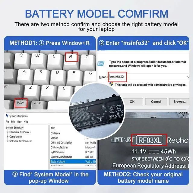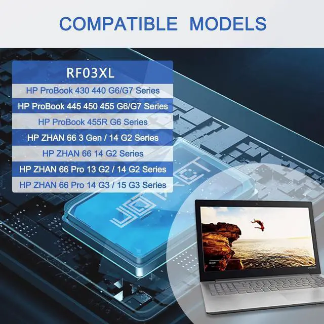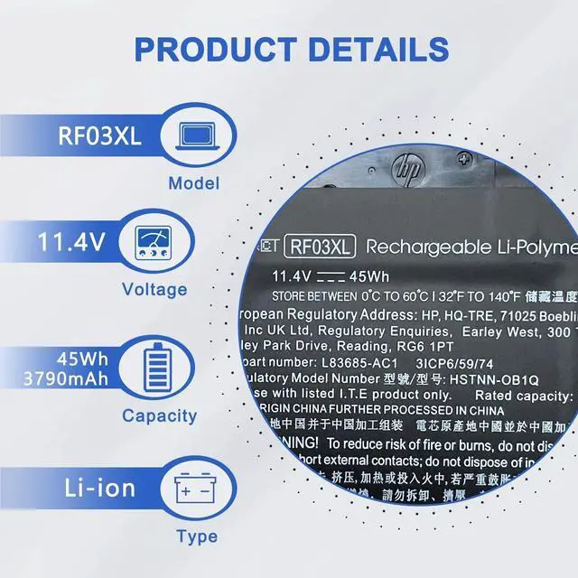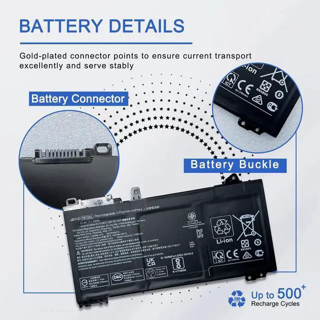 Battery Type: Lithium ion ^^^^ Up to 1000+ recharge cycles over the life of the battery. ^^ Compatible with Laptop ModelsFor HP ProBook 430 G6/G7 Series; HP ProBook 440 G6/G7 Series; HP ProBook 445 G6/G7 Series; HP ProBook 450 G6/G7 Series; HP ProBook 455 G6/G7 Series; HP ProBook 455R G6 Series; HP ZHAN 66 3 Gen Series; HP ZHAN 66 14 G2 Series; HP ZHAN 66 Pro 13 G2 Series; HP ZHAN 66 Pro 14 G2 Series; HP ZHAN 66 Pro 14 G3 Series; HP ZHAN 66 Pro 15 G3 Series ^^ Replacement for Part NumberRF03XL / RE03XL / L32407-2B1 / L32407-2C1 / L32407-541 / L32407-AC1 / L32656-002 / L32656-005 / L83685-AC1 / L84354-005 / HSTNN-OB1C / HSTNN-OB1Q / HSTNN-DB9A / HSTNN-UB7R / HSN-Q17C-4 / HSN-Q17C-5 / HSN-Q21C / HSN-Q25C ^^ Quality AssuranceAll our products are Certified by CE, and FCC strictly test to ensure both safety and longer life. And standards compliance for environment safety. All our products are 100% brand-new from manufacturer. ^^ Worry-Free Warranty Service30 days-Money Back // 90 days-Free Replacement // 12 mouth Hassle-Free