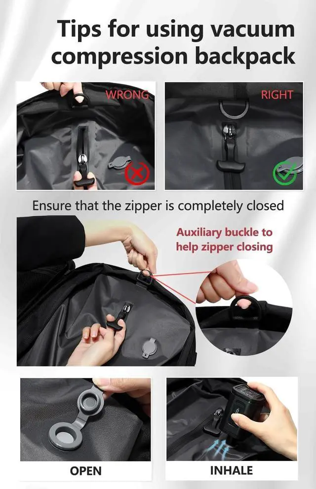 Backpack: External vacuum pump compresses the backpack, allowing you to pack more and carry less! ^^