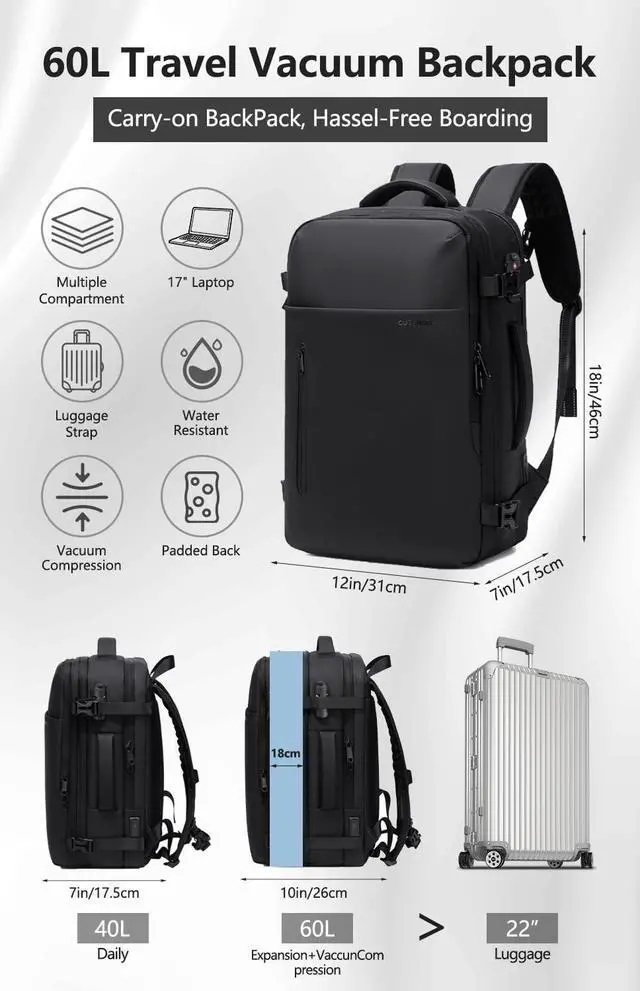 Vacuum Backpack EXPANDABLE CAPACITY: Versatile 45L (carry-on friendly) 60L (XL capacity) design adapts to short trips or extended adventures.