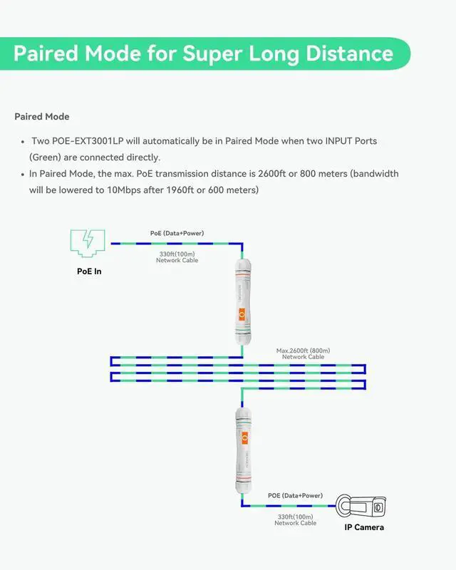 PoE EXTENDER - Extend extra 330ft or 100m POE + Ethernet network at 100Mbps bandwidth when using one of the PoE Extenders. ^^ UP TO 2600ft SUPER LONG PoE TRANSMISSION DISTANCE - Two POE-EXT3001LP will automatically be in Paired Mode when two INPUT Ports (Orange) are connected directly. In Paired Mode, the max. PoE transmission distance is 2600ft or 800 meters (bandwidth will be lowered to 10Mbps after 1960ft or 600 meters). ^^ OUTDOOR RATED - IP67 waterproof standard, wide temperature range -10C ~50C (14F122F), designed for harsh outdoor environments. ^^ COMPLIANT TO IEEE 802.3AF /AT STANDARD - Working with all standard IEEE 802.3 af/at POE Switches/POE injectors/POE NVRs.