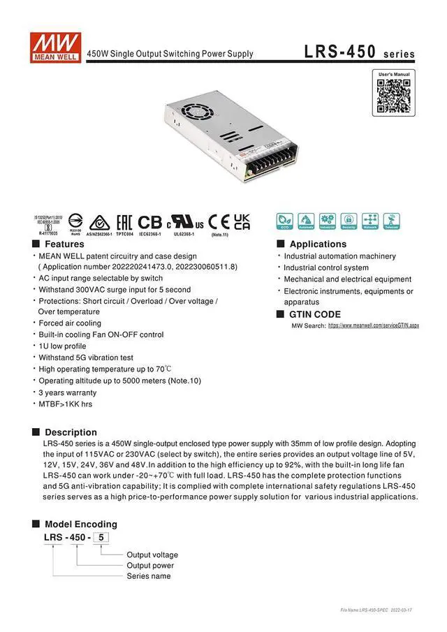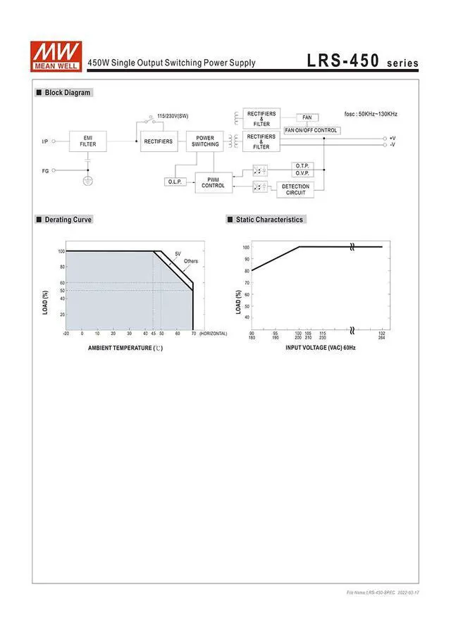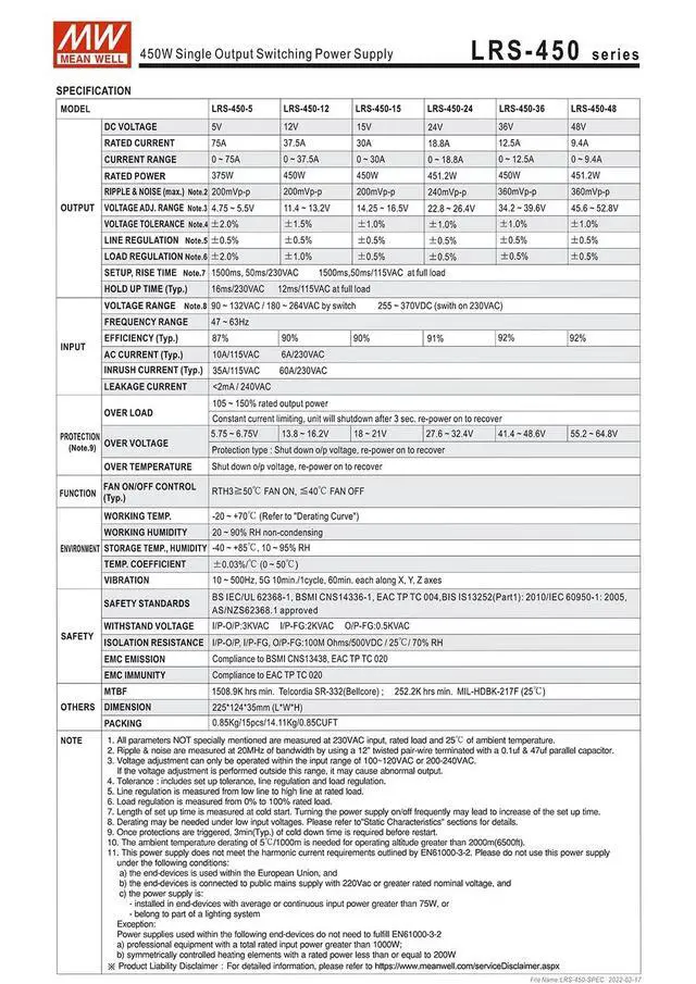 Model LRS-450-12 DC Voltage 12V, Rated Current 37.5A, Power 450W