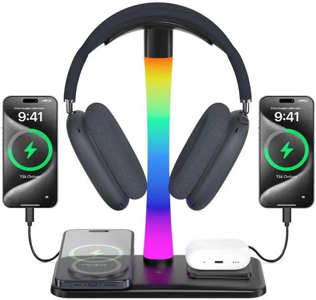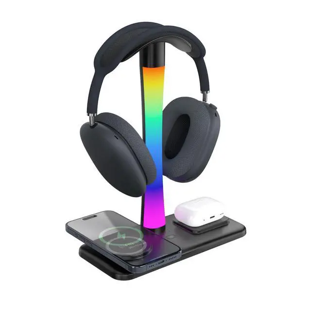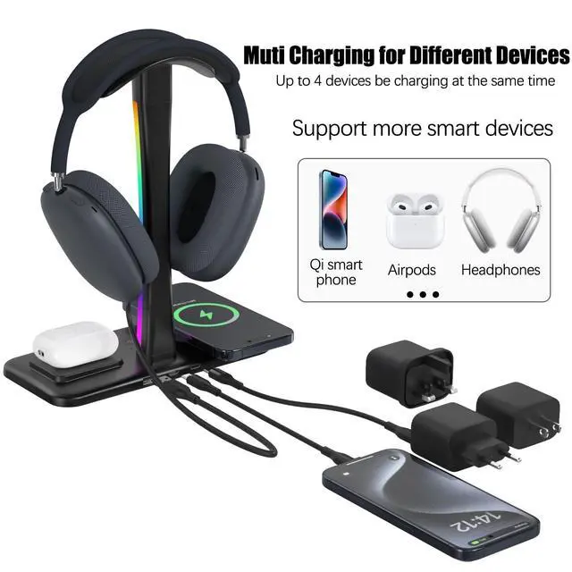 Charging Station: Tascaquin headphone stand built-in 2 wireless charging pad & 1 Type-C & 1 USB output port which mean you can charge 4 devices at same time, power up to 15W ^^