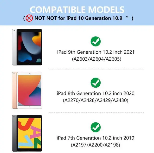 10.2 inch for iPad keyboard case: Amzcase for iPad 9th/8th/7th generation case with keyboard compatible with 2021 New iPad 9th Gen (2603/2604/2605), for 2020 iPad 8th Gen (A2270/A2430/A2428/A2429), for 2019 iPad 7th Gen(A2197/A2200/A2198). Please check the back of iPad to confirm the model number before you order keyboard for iPad 9th generation ^^