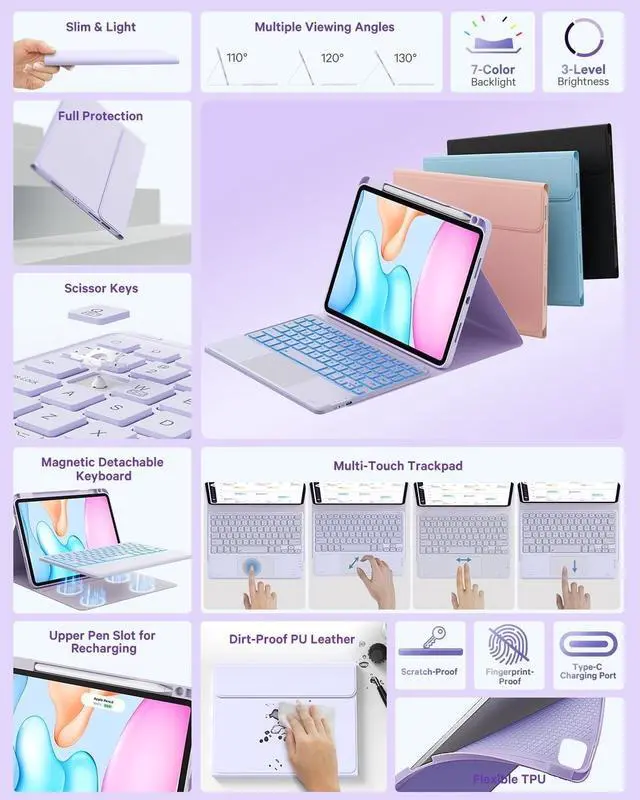 ^^ [Smart Trackpad] This keyboard with touchpad for iPad Pro 11 is often more compact and lightweight, making it easier to transport and use with a laptop or tablet. The touchpad features the latest anti-touch technology and supports multi-functional gestures. That makes you more efficient and relaxed when using it. ^^ [Upper Pencil Slot] We designed the slot for the Apple Pencil to be integrated into the top of keyboard case, meaning you can carry it with you all the time instead of having to take it separately. And the pen slot supports charging for Apple Pencil. ^^ [Detachable Keyboard Case] Both the keyboard and the case where the keyboard is placed have magnetic attraction. The detachable design allows the keyboard to be used from a distance, making it easy to use in a variety of scenarios.