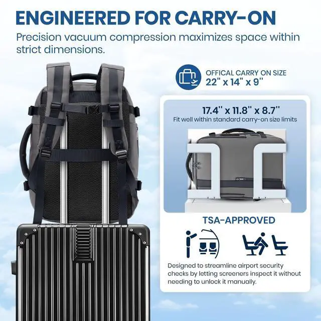 TRAVEL BACKPACK: The vacuum carry on backpack features breathable honeycomb-patterned wide sponge straps that evenly distribute shoulder pressure, along with an adjustable chest buckel to help balance the weight, ensuring comfort even during extended wear. The luggage strap allows easy attachment to suitcases, freeing your shoulders. Designed for comfortable and convenient travel, it's perfect for trips, business travel, or everyday use by men and women