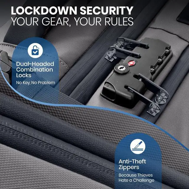 SECURITY UPGRADE: TSA-Approved double-headed lock seals laptop & main compartments simultaneously, protecting valuables and speeding through airline security checks. Anti-theft zippers resist prying, while sealed design enhances theft proof. Waterproof fabric offer protection during outdoor trips like walking. Vacspace tech ensures compartments stay sealed. Multiple safeguards (backspace reinforcement, vacbag construction) make business or traveling worry-free. Complies with carryon standards ^^