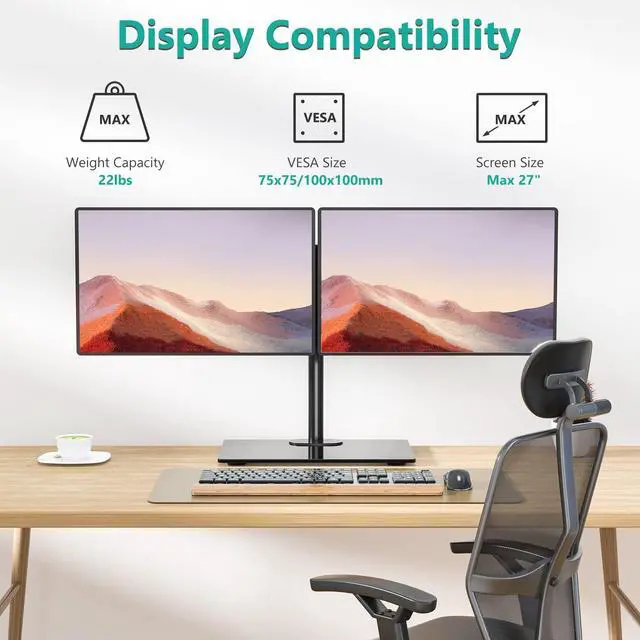 Application: Fit most LCD, LED flat screen TVs and monitors up to 27 inches, and support weight up to 22 lbs. per arm. Fits VESA 75x75mm or 100x100mm. The free-standing glass base is 16.8 x 10.2. The 4 diameter Grommet-Base applied to 0.4 -3 thick desk ^^