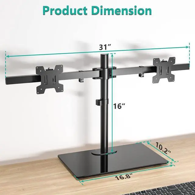 Package Includes: 1 x WALI Free Standing Dual Monitor Mount with Glass Base (Black), Mounting Hardware Kit, User Manual, experienced and friendly US based customer support available to assist 7 days a week