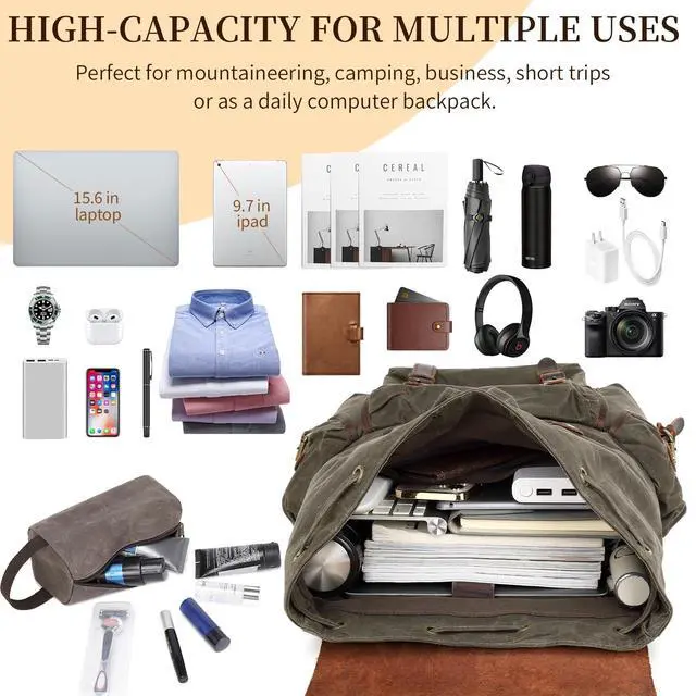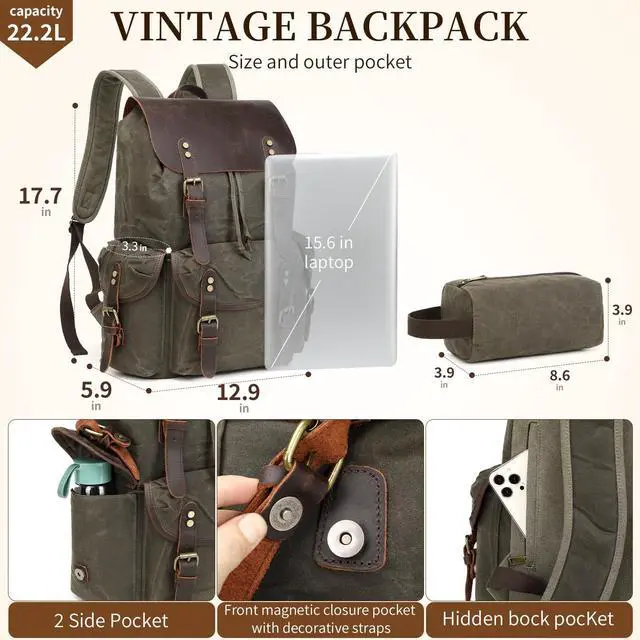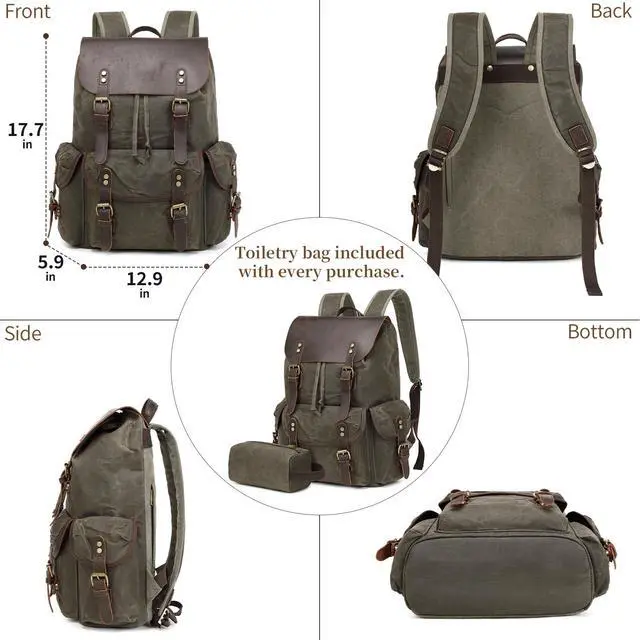 Perfect Rucksack with Toiletry bagThis leather backpack dimensions is 13.7L x 5.9 H x 17.7 W inch, with a capacity of 22 liters, which can accommodate laptops, iPads, books, cameras, shaving equipment, clothing or other essentials. And it comes with a free toiletry bag, which can helping you organize and maximize your space when travel. ^^ Genuine Leather-Waxed Canvas BackpackThis backpack is made of waxed canvas with premium genuine Crazy Horse leather trim. High-density canvas is made of pure cotton, tightly woven and waxed, making it strong, abrasion-resistant, scratch-resistant and waterproof, effectively protecting your tech products.