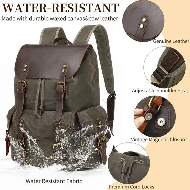NOTE: Back anti-theft pocket securely stores valuables such as wallet, cell phone or cash. ^^ Wide Application Canvas BackpackLeather-Waxed Canvas Backpack can be used as a daypack, international travel backpacks, outdoor backpacks, hilking backpacks, bushcraft backpack, computer leather backpacks. (Please note that this product uses special technology and the material is hard, but it will become soft after use for a period of time. )