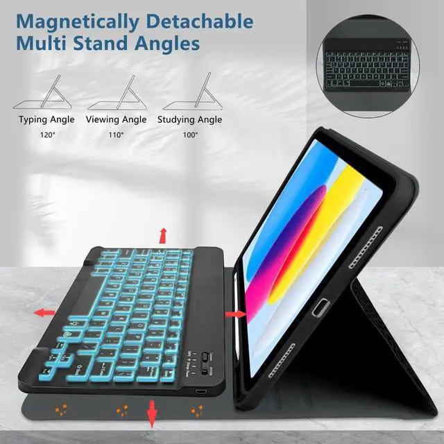 Generation (Model Number: A2696/A2757/A2777). iPad 11th (A16) generation 11-inch 2025 (ModelA3354, A3355, A3356), Please check the model number on the back of your iPad before purchasing ^^ [Pencil Holder and Multi-angle Adjustable Support] This 10th generation iPad tablet case has a built-in Pencil holder that makes it easy to carry Pencil and take it out. The iPad case has three grooves that can be used at three angles, and is made of non-slip material that supports the iPad to stand up. ^^ [Rechargeable Keyboard] The iPad Bluetooth keyboard has a built-in battery with high stability, so you don't need to replace the battery. You can charge the keyboard using the charging cable that comes with the keyboard. The keyboard has a Bluetooth acceptance range of 10 meters. If you don't need to use the keyboard, you can remove it and turn it into a regular iPad case, which makes for a handy experience. ^^ [Automatic Sleep/Wake] This iPad case will automatically put your iPad to sleep when you close the front cover of the case. Because an iron keyboard may prevent magnets from attracting to each other, remove the keyboard for optimal sleep/wake up.