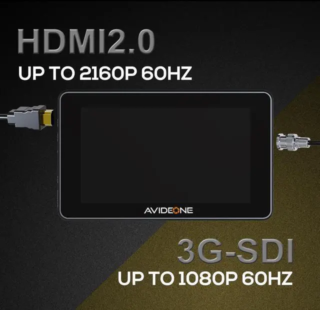 2000nit Ultra-BrightAVIDEONE 1920x1080 Full HD DSLR camera field monitor featured 5.5" IPS Screen with High Brightness 2000 Nits, brightness for outdoor sunlight readable. ^^ 4K HDMI & 3G-SDIThis DSLR camera field monitor featured with HDMI 2.0 supports up to 2160p60Hz HDMI signal and 3G-SDI supports up to 1080p60 3G-SDI signal, and can loop output to the other monitor or device when HDMI / 3G-SDI signal input to monitor.