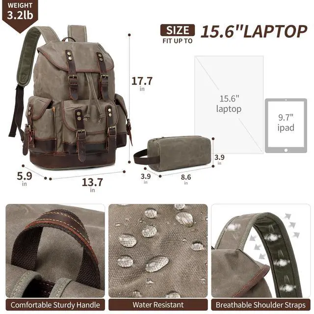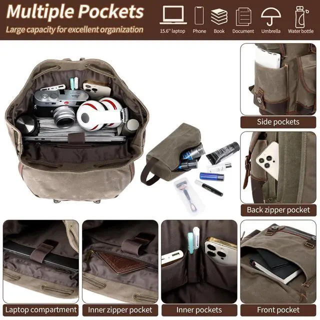 Toiletry Bag: The large canvas backpack can accommodate folders, A4 files, laptops, iPads, books, cameras, shaving kits, clothing, and other essentials. Additionally, it includes a complimentary toiletry bag, helping you organize and optimize your space while traveling.