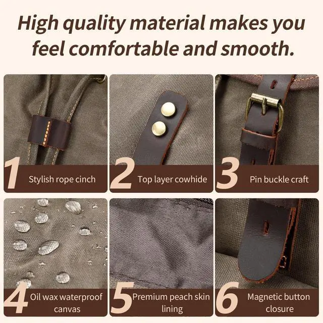 Waxed Canvas Backpack: This backpack combines waxed canvas with high-quality Crazy Horse leather accents. The high-density canvas, made from pure cotton and tightly woven with a wax finish, offers excellent strength, abrasion resistance, scratch resistance, and waterproofing, ensuring protection for your tech items.