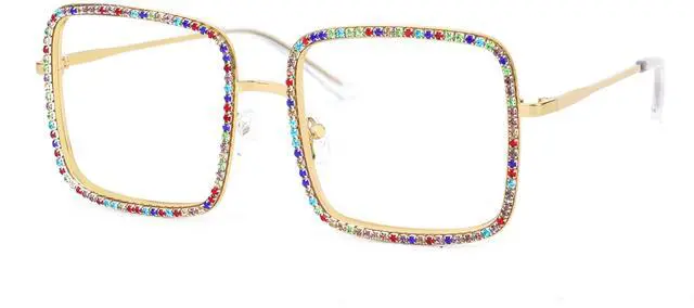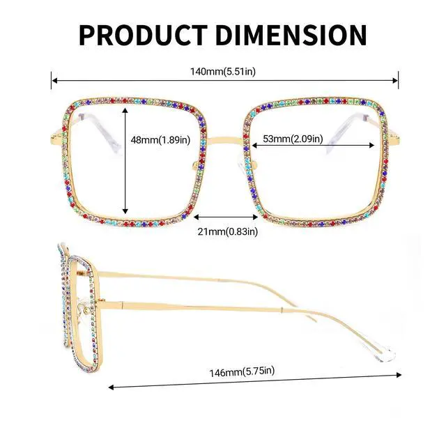 [Frame Design]Golden square frame adorned with colorful rhinestone, radiantly dazzling, suitable for both party events and daily wear, exuding abundant style ^^ [Hd Lens]High-definition, high-lens lenses are adopted, with excellent anti-wear and scratch performance, high light transmittance, helping to restore real colors and bringing a new visual experience ^^ [Non-Prescription] High-definition clear lens eyeglasses with the option to have prescription lenses adjusted by a healthcare professional, No reading magnification ^^ [Frame Material]Metal temple arms with plastic wrapping reduce pressure on the ears; English-style nose pads provide comfortable wear, alleviating the burden on the bridge of the nose ^^ [Square