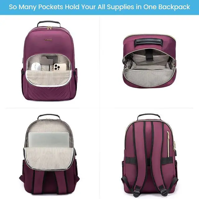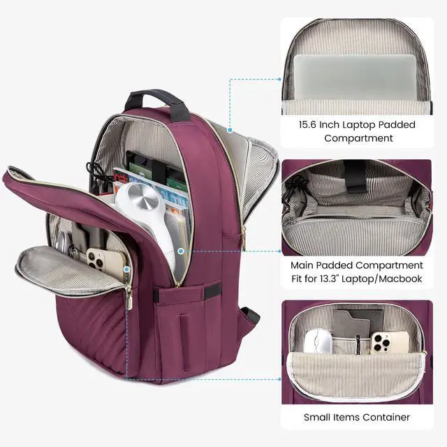 LARGE CAPACITYOne backpack to solve all travel troubles. The travel backpack has multiple compartments to hold the laptops, iPads, phones, charger, binders, bottles, umbrellas, magazines, clothes, pens, wallets, and more. ^^ MULTI-COMPARTMENTS & POCKETSThis women's business work backpack is designed with 4 compartments and 17 pockets, which can organize your travel items in an orderly manner. ^^ LAPTOP PROTECTIONThe backpack has a 17.3 -inch laptop pocket, a 12.9 -inch iPad slot. The pockets are sewn around with a cushioning material that maximizes physical protection for your laptop.