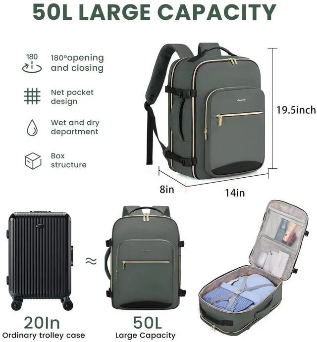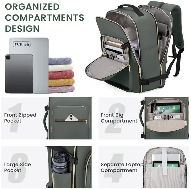 50L LARGE CAPACITYOur travel backpacks enable you to pack all your travel essentials for a 7-9 day travel, which can hold 3-7 days' clothing, a pair of shoes, your wallets, toiletries, a 17.3 '' laptop, a 12.9 '' iPad and so on. The side straps can also help you compress the pack when it is too full. ^^ WELL-DESIGNED COMPARTMENTSThis travel backpack has 4 main compartments and 3 packing cubes supplied, which enable you to keep your things in order. Your shoes, toiletries, and underwear can be placed in separate packing cubes.