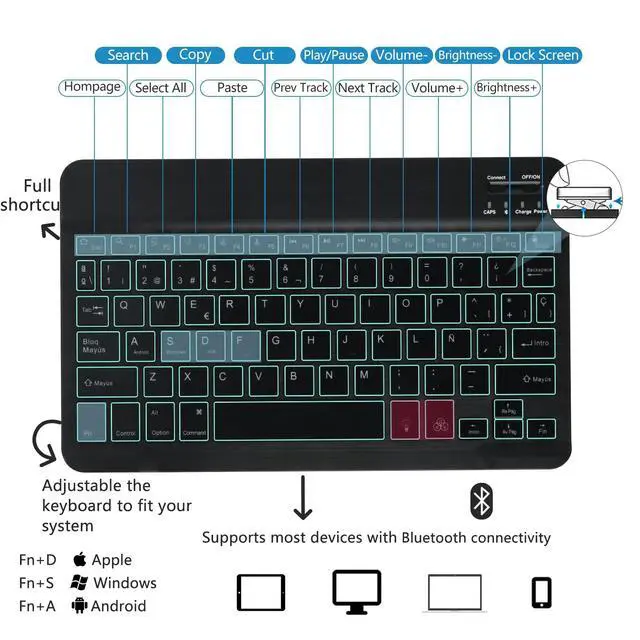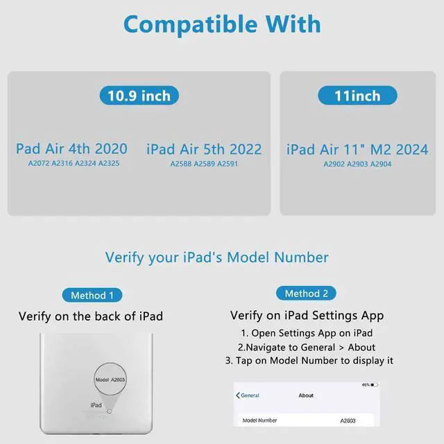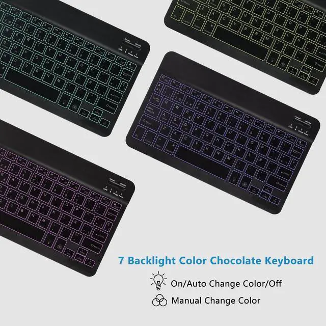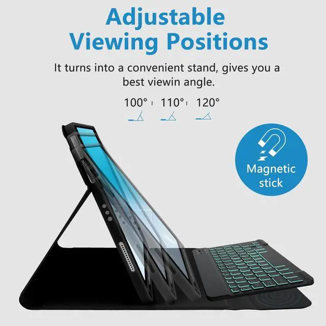 Pro (compatible iPad models: A2072/A2316/A2324/A2325/A2588/A2589/A2591/A2902/A2903/A2904/A3267/A3270/A1980/A2013/A1934/A1979). Before purchasing, please check the model code (A+number) on the back of your iPad. (The product does not include a pen. ) ^^ Seven-color Backlit KeyboardThis iPad Air 11 inch case keyboard features a 220 mAh battery, three brightness modes, and seven backlight colors, making typing easy even in low-light environments. The iPad Air case with keyboard also includes a row of shortcut keys for one-touch access to frequently used functions, such as volume and media controls, brightness adjustment, and more. With the included charging cable, you can easily maintain battery life and work comfortably all day. ^^ Elegant ChoiceElevate your tech style with our sophisticated black iPad Air case with keyboard 11 inch! Its deep matte black finish delivers a timeless and professional alternative to bright colors, while the smooth texture creates a sleek and refined look that adds a touch of modern luxury to your device. The elegant coating resists fingerprints and remains durable over time, ensuring your iPad not only stands out with understated style but also enjoys reliable protection. ^^ Multi-Viewing Angles & Anti-Slip DesignThis iPad Air case 11 inch with keyboard features 3 built-in dents that securely prop your device into 3 different viewing angles in landscape mode.