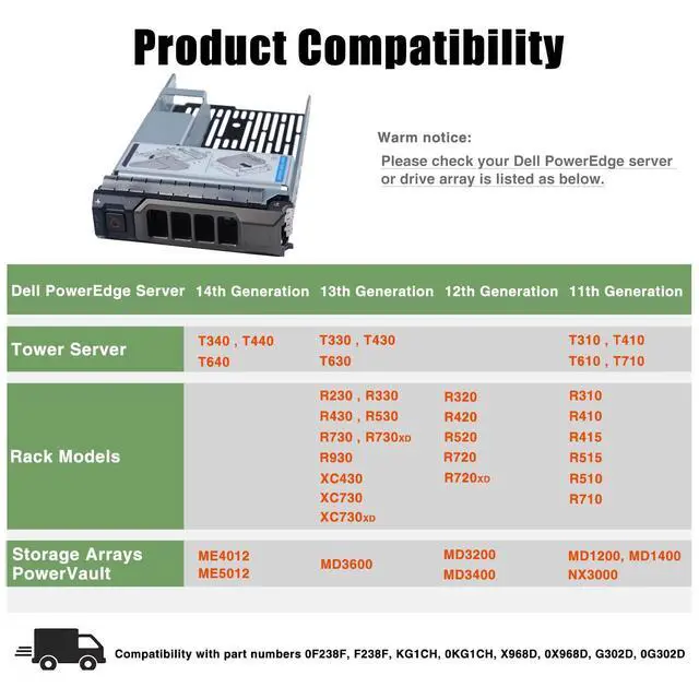 ; 2.5" adapter: 9W8C4 ^^ Full Compatibility It Support 3.5 / 2.5 inch SAS or SATA drives, Heretom hard drive tray caddy is compatible for PowerEdge 14th Generation T340, T440, T640; PowerEdge 13th Generation R230, R330, T330, R430, T430, R530, T630, R730, R730xd, R930, XC430, XC730, XC730xd; PowerEdge 12th Generation R320, T320, R420, T420, R520, T620, R720, R720XD; PowerEdge 11th Generation R310, T310, R410, R415, T410, R510, R515, T610, R710, T710; PowerVault ME5012, ME4012, MD3600, MD3400, MD3200, NX3000, MD1200, MD1400 ^^ Study and Durable The hard drive bracket is made of metal with sturdy and durable, not easily get out of shape. The hollow design at the bottom can help dissipate heat effectively, allows for protecting your hard drive in multiple ways. ^^ What you get 3.5" hard drive bracket x4, 2.5" adatper x4, mounting screws x48, a 12-month warranty and lifetime technical support.