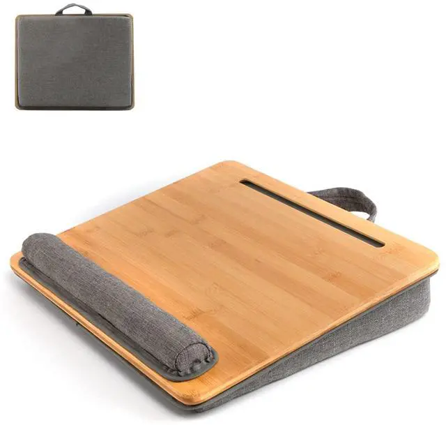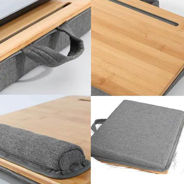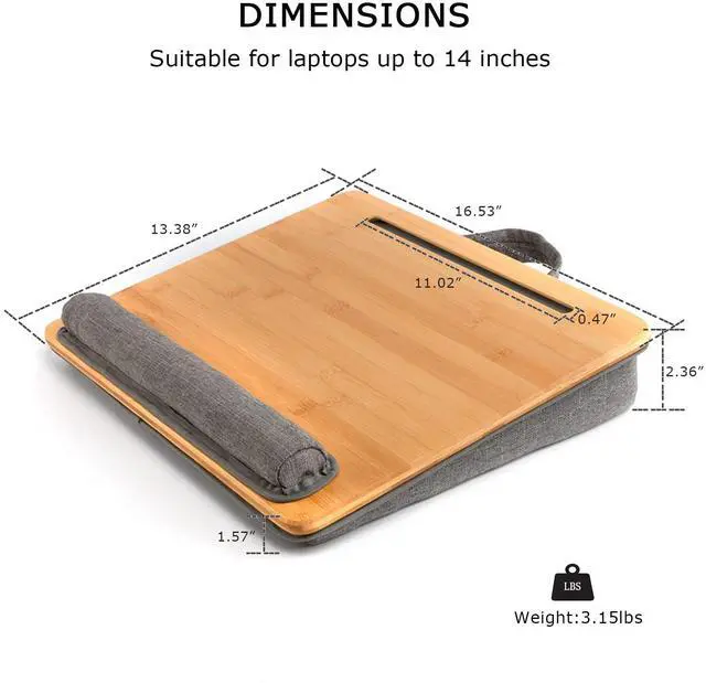 Perfect Size&WeightBamboo surface with a perfect size: 16.53" x 13.38". This lap desk fits up to 15.6 inches laptop. The total weight is only 3.15 lbs, very lightweight. ^^ Sturdy MaterialThe lap table top is made of bamboo, it makes a great alternative from plastic product. Bamboo is much more sturdier than other wood, and could keep beautiful forever with natural favor. ^^ VersatilityOur laptop lap desk is convenient to place laptops, tablet, mobile phones, books and magazine, which is great for you to use on sofa or in the car. It is also workable when travelling. It has a phone slot at the top of the surface, which allows you to use multiple devices at the same time. Also a great dorm room essential for college students. ^^ Comfortable&SecureThe Laptop Stand comes with breathable fabric cushion that conforms to your lap and provide more comfort and stability. With wrist cushion or anti-slip stopper at the end of the surface, it can keep your laptop or other devices safe while in use. ^^ Portable&Space SavingWith soft handle, you are allowed to take the lap desk to anywhere easily.