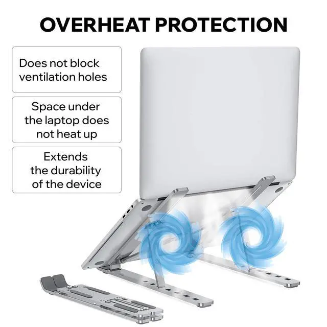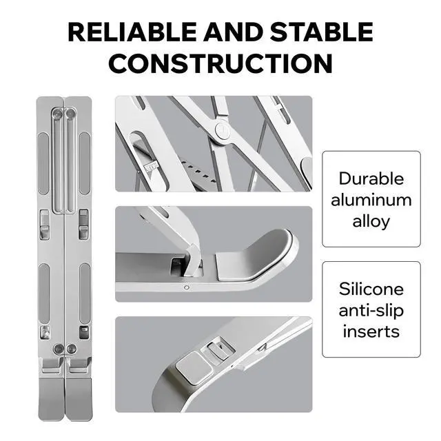 Adjusting the height to your preference minimizes eye strain and enhances productivity, making it an excellent choice for professionals, students, and gamers. Superior Build Quality Crafted from high-grade aluminum alloy, this laptop stand is built for durability and stability. The strong metal frame can support even the heaviest laptops without wobbling. Non-slip silicone pads keep your device secure and prevent scratches, while the open-frame design enhances airflow to keep your laptop cool. Foldable & Portable Designed for convenience, our laptop stand easily folds into a compact size, making it perfect for travel or storage.
