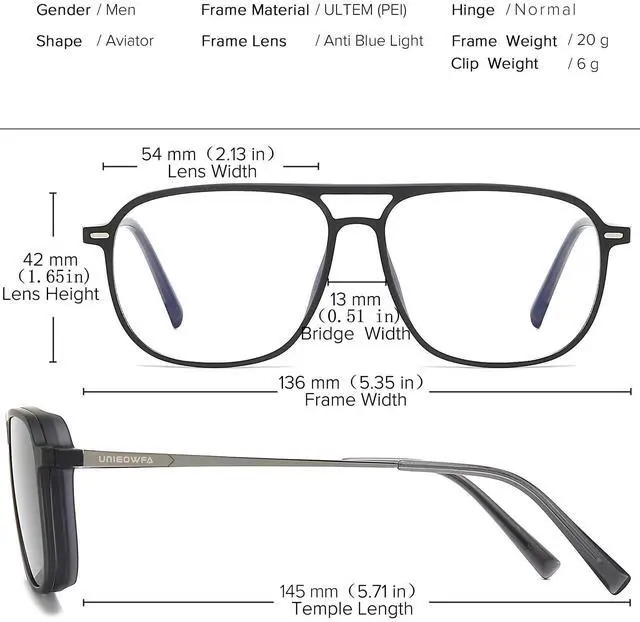 Multifunctional Glasses DesignThe magnetic clip on sunglasses is very convenient to wear. The magnets on both sides of the clip will automatically adsorption the frame together when approaching. When you are using a computer and phone, it is anti blue light glasses. When you are outside in the sunlight, put on the polarised clip, it's sunglasses. If you are driving, put on yellow clip, it's driving glasses. ^^ Super Hydrophobic Anti Blue Light LensesUNIEOWFA blue light blocking glasses lenses adopt AR double-sided blue light anti-radiation film and anti-reflective film, which can absorb blue light between 380nm and 450nm, and also have UV protection function.