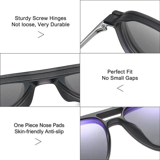 • Multifunctional Glasses DesignThe magnetic clip on sunglasses is very convenient to wear. The magnets on both sides of the clip will automatically adsorption the frame together when approaching. When you are using a computer and phone, it is anti blue light glasses. When you are outside in the sunlight, put on the polarised clip, it's sunglasses. If you are driving, put on yellow clip, it's driving glasses.