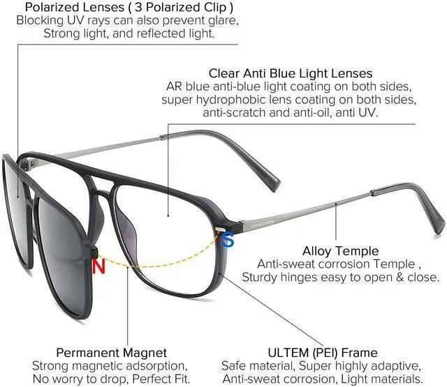 Both sides of the lens are coated with super hydrophobic coating, which is scratch-proof and oil-proof and easy to clean. The lens is made of PC, the lens is not easy to break. ^^ ULTEM frame is made of ultra-light ULTEM, which is light, flexible, not easy to deform, and crashworthy wear resistance. UNIEOWFA has always been committed to providing glasses users with a more comfortable wearing experience. ^^ 3Pcs Polarized Magnetic ClipThe black and gradient gray polarized clips are used under different intensities of sunlight during the day, and the yellow clip is used for driving.