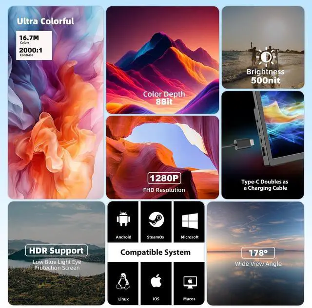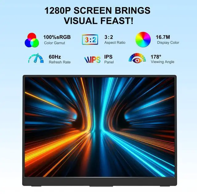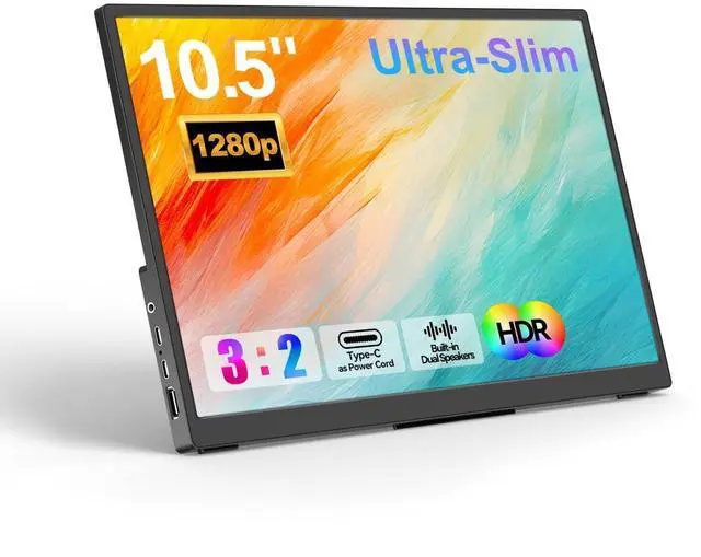 FHD IPS Display with Stunning ClarityThis 10.5 inch portable monitor uses IPS screen display technology, built-in 19201280 pixel LCD screen. The 178 degree viewing Angle gives you more vivid images and details. Users feel the beauty of multiple perspectives. Up to 100%RGB and 500Nit pixels at the same time, providing users with a clearer and smoother picture ^^ Ultra-Slim & Lightweight DesignThis 10.5 -inch portable laptop monitor is specially designed for portability, featuring a smooth ultra-thin plastic casing and a lightweight structure. Its compact 3:2 aspect ratio provides more vertical space, reducing working time and alleviating eye strain.