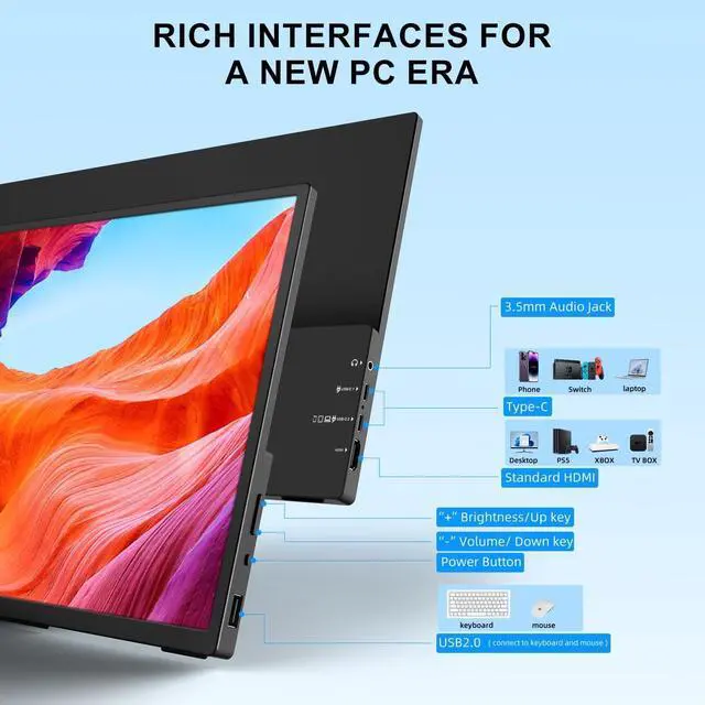 Perfect for travelers and remote workers, it can easily fit into your bag without adding extra weight ^^ Plug & Play ConvenienceThe 10.5 -inch portable monitor is equipped with 2 Type-C interfaces (1 full-function) and 1 standard HDMI interface, allowing for easy connection to PC /Switch game consoles /PS3/4/5. No additional applications are required. It is plug-and-play and provides users with a stable connection and stable data transmission while working or playing. Built-in dual-channel stereo speakers enhance user experience ^^ Support VESA bracket installation, flexible use in multiple scenariosThis portable monitor supports VESA standard wall mounting, providing users with greater flexibility in use.
