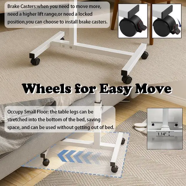 CUSTOMIZABLE HEIGHT & MULTI-FUNCTION SINGLE SURFACE: Enjoy a customizable workspace with this innovative computer table for bed! It features smooth height adjustment ( 23.2235. 03) and a smartly zoned single surface. The large area holds laptops/tablets up to 14 and includes a non-slip iPad slot and built-in cup holder. Ideal as an adjustable desk for work, dining, or hobbies, it also works perfectly as a portable laptop stand and bed table tray for eating and laptop ^^ SPACE-SAVING FOLDABLE DESIGN & SMART WHEEL SYSTEM: Maximize your space effortlessly! This rolling adjustable height desk features an innovative foldable design for ultra-compact storage. When not in use, simply fold it down and slide it under beds or sofas thanks to its 3-inch low clearance. Four high-quality locking casters with brakes ensure stability on any surface, making it an ideal portable laptop stand for dynamic environments like home offices, hospitals, or living rooms ^^