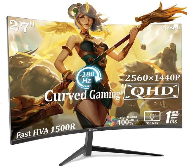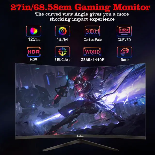 Performance: Elevate your visual experience with GreBear's 1440p 27 in gaming curved computer monitor. The advanced VA screen delivers QHD (2560*1440) resolution, boasting 125% sRGB, 300cd/m brightness, 8-bit color depth, and a vast 16.7 million color gamut. Immerse yourself in deeper, more defined colors for stunningly clear, bright, and vivid images with intricate details.