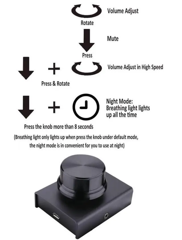 USB Volume Control KnobThis USB Volume Control KnobPlug and play, no driver required, you can directly connect to the computer operating system through the cable to adjust the volume. All in one functionThe multimedia controller can adjust 3 options control the volume dial, it can pause/play, back, forward and mute controls, give you quick access to the media controls. Detachable USB CableConvenient to replace cables to fit different distances. Convenient to replace cables to fit different devices. Blue Breathing Light/b>Indicates the current working status. Easy to locate the item at night.