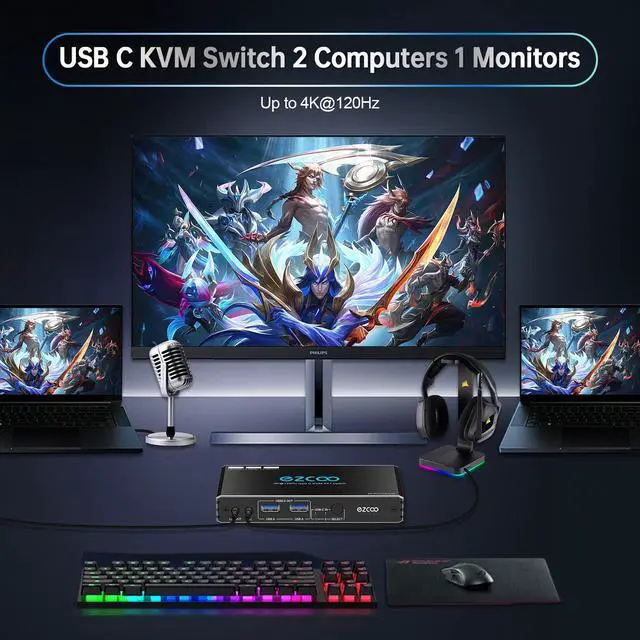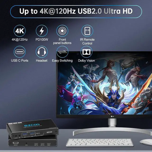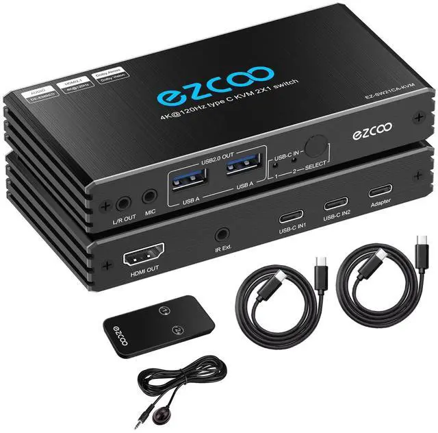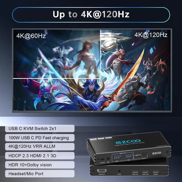 HDMI 2.1 USB C KVM Switch This USB C KVM switch allows 2 USB-C laptops to share 1 monitors 2 USB 2.0 devices and L/R MIC OUT, such as a set of keyboard, mouse, hard drives, U disk, and printer. You can easily switch between two laptops, improving your work efficiency greatly. ^^ Video & Audio FormatVideo FormatThe 2x1 HDMI 2.1 Type C Switch supports multiple resolution up to 4K@120Hz, 5120x1440@120Hz, 1080P@240Hz, 4:4: 4 8bit. Also supports VRR, ALLM, HDR 10+, D-o-l-b-y vision, 3D vision, HDCP 2.2, HDCP 2.3 bypass. Audio FormatSupports AUX L/R 3.5 mm 2.1C h, D-o-l-b-y Atmos, D-o-l-b-y True HD, DTS-HD Master Audio. ^^ PD 100W Fast Charging &