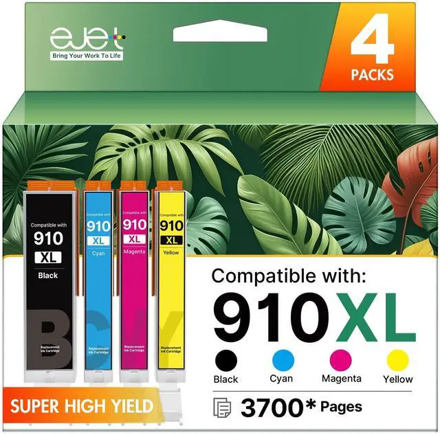 Ink Capacity]: ejet for HP 910 ink has up to 1, 200 pages for HP 910xl black and 1, 000 pages for each HP910xl/910 multipack xl color ink cartridges(cyan, magenta and yellow) at 5% coverage for A4 paper. With a 40% increase in capacity compared to ordinary ink cartridges and a 15% reduction in cost per page ^^ [Outstanding Printing Quality] Utilizing a high-quality ink formula, the 910 XL ink cartridges ensures that the printed output has rich and vibrant colors with high fidelity, and the black text is clear and sharp with distinct edges ^^ [Smart Chip Technology] ejet for HP 910xl ink cartridges combo pack is equipped with high-quality smart chips. Its design is stable and reliable, capable of precisely monitoring ink volume, accurately identifying and displaying the remaining ink quantity, and enabling plug-and-play functionality ^^ [Real-time Ink Level Track] ejet for HP 910xl ink cartridges combo pack is equipped with high-quality smart chips. Its design is stable and reliable, capable of precisely monitoring ink volume, accurately identifying and displaying the remaining ink quantity, and enabling plug-and-play functionality ^^ [Package Contents] Totally 4 Pack for HP 910xl Ink Cartridges, Includes 1 x 910xl Black Ink Cartridges, 1 x 910xl Cyan Ink Cartridges, 1 x 910xl Magenta Ink Cartridges, 1 x 910xl Yellow Ink Cartridges and 1 x User Guide