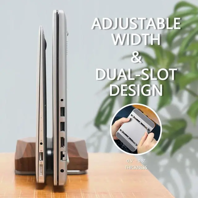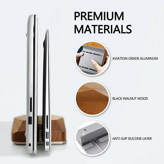 ^^ Eco-Conscious Choice: Handmade with natural walnut wood and recyclable aluminum, No assembly required. Our MacBook vertical stand, entirely plastic-free, not only supports environmental sustainability but also elevates the aesthetic of your space.