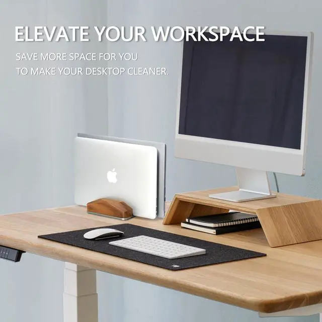 Elevate Workspace: Maximize your workspace with a stylish black walnut wooden vertical stand for laptops and MacBooks. This stand provides a secure and elegant cradle for your device, freeing up valuable desk space while protecting against spills.