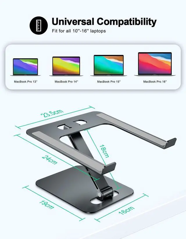 These considerate designs are to ensure you better use. ^^ Cooling & VentilationThe laptop holder only has two holder hands but not a whole flat, so there is more space to enable the heat to vent and keep your laptop from overheating. ^^ Muti-Use & PracticalMulti-use in many occasions such as offices, meeting rooms, living room, kitchens and other occasions to hold the laptops. At the same time, the bottom storage slot can store small items such as mobile phones, keys, etc. ^^ Wide CompatibilityCompatible with all laptops 10 to 16 inches, and compatible with MacBook/ MacBook Air/ MacBook Pro/ Microsoft Surface/HP/ Dell/ Google laptops up to 16 inches, etc.