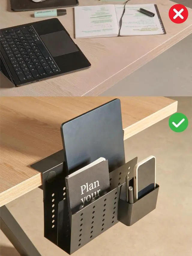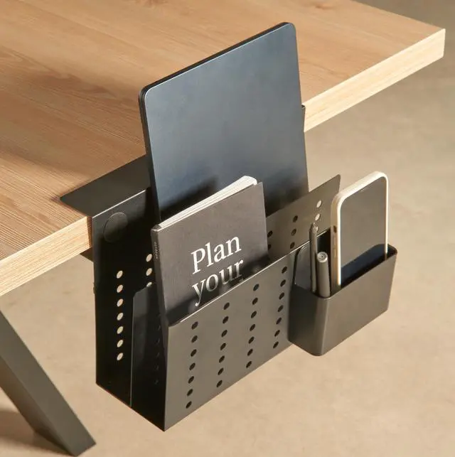 Whether youre a busy professional or a student, this organizer stands strong, providing dependable storage and an elegant workspace solution you can trust. ^^ ENHANCED WORKSPACE EFFICIENCY Designed to maximize functionality, this organizer declutters your desk and optimizes space. Ideal for small desks or multi-tasking setups, it keeps your workspace neat, freeing your mind for creativity. Whether working, studying, or creating, the Desk Side Storage Organizer is your key to efficiency and productivity. ^^ WHAT'S INCLUDED One Laptop No-Drill Side storage black, one black stationery holder.