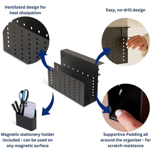 With everything within reach, productivity becomes effortless. ^^ NON-SCRATCH, NON-SLIP SURFACE WITH HEAT DISSIPATION Protect your devices with a sturdy, non-slip surface designed for ultimate care. The organizer prevents scratches and keeps your devices secure. Built-in heat dissipation holes ensure your laptop and electronics stay cool, enhancing performance and longevity. Its a safe, stylish way to store your essentials. ^^ STURDY AND DURABLE CONSTRUCTION Crafted with premium materials, the Desk Side Storage Organizer is built to last. Its robust frame holds up to daily use while maintaining its sleek design.